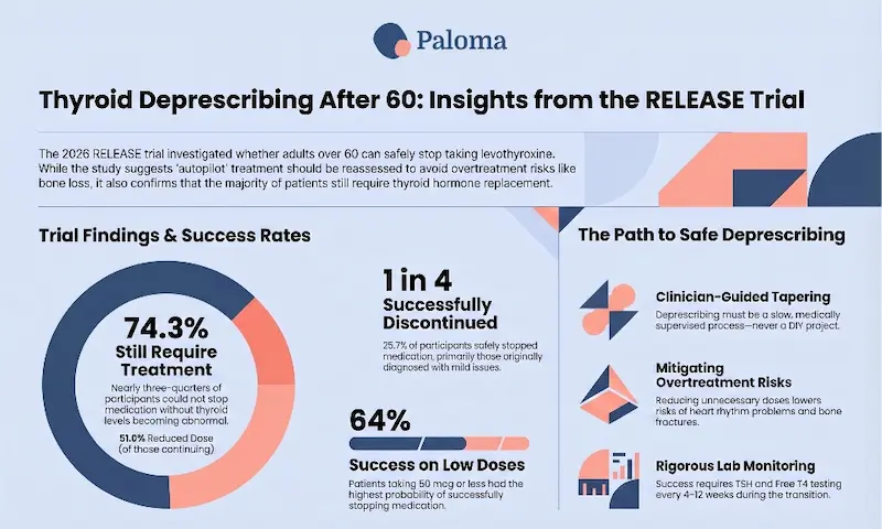 Paloma Health is uniquely positioned to help patients safely evaluate whether thyroid hormone therapy should be continued or carefully reduced. With affordable, convenient at-home thyroid testing and access to clinicians who specialize in thyroid care, Paloma makes it easier to monitor key thyroid lab values throughout any deprescribing process—without the barriers of frequent in-office visits or high costs.